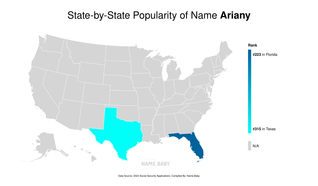 Ariany is a feminine given name of Spanish derivation, articulated in English as uh-ree-AHN-ee (/əˈriːɑni/) and in Spanish as ah-ree-AHN-ee (/aˈrjani/), which appears to derive from the Greek Ariadne, meaning “most holy” or “utterly pure,” and may also be understood as a modern variant of the name Ariana. Historically uncommon yet consistently present in American naming registers since the early 2000s, Ariany has recorded between five and seventy-four annual occurrences, achieving a rank of 899 with fifty-one newborns in 2024. Its sustained visibility, marked by periodic fluctuations within the top 1,000, underscores a quiet resilience and an academic interest in names that blend classical etymology with contemporary global sensibilities. In scholarly terms, Ariany exemplifies the transnational fluidity of personal names, carrying associations of devotion, refinement and cross-cultural adaptability without resort to overtly metaphorical embellishment.