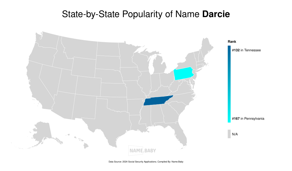 Darcie is an Anglo-American feminine forename of Norman origin, deriving from the medieval toponymic surname d’Arcy—literally “from Arcy” in northern France—whose adoption into English-speaking contexts reflects the broader nineteenth-century practice of repurposing surnames as given names. Garnering literary prestige through Jane Austen’s portrayal of Fitzwilliam Darcy in Pride and Prejudice, the name has acquired associations of genteel reserve and understated elegance, qualities further underscored by its distinctive spelling variant, Darcie. In the United States, Darcie has maintained a consistent presence within the top one thousand since the early 1980s—peaking at rank 627 in 1980 and stabilizing near ranks 800–900 in subsequent decades; in 2024, sixty newborn girls bore this appellation (rank 890), indicating a modest yet enduring preference within contemporary Anglo-American naming patterns. Pronounced DAHR-see (/dɑrˈsi/), Darcie embodies cool refinement grounded in its historic origins.