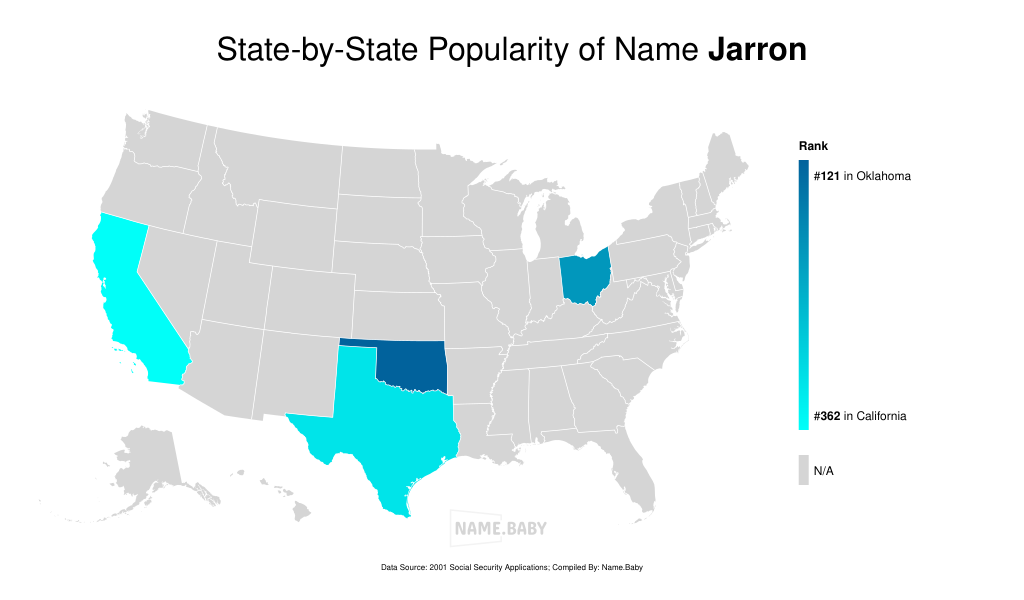 Jarron is a masculine name with English origins. It is pronounced as JAIR-uhn (/dʒeɪˈrən/). The name has variations, such as Jarren. In terms of popularity in the United States, Jarron has seen fluctuating occurrences over the years. In recent data, it ranked 12,119th in 2021 and 5,799th in 2019. While the name may not be as widely used as some others, it still carries a unique charm that sets it apart. Jarron does not have any specific associations or meanings commonly associated with it, providing parents with a chance to create their own special connection to the name for their baby boy.