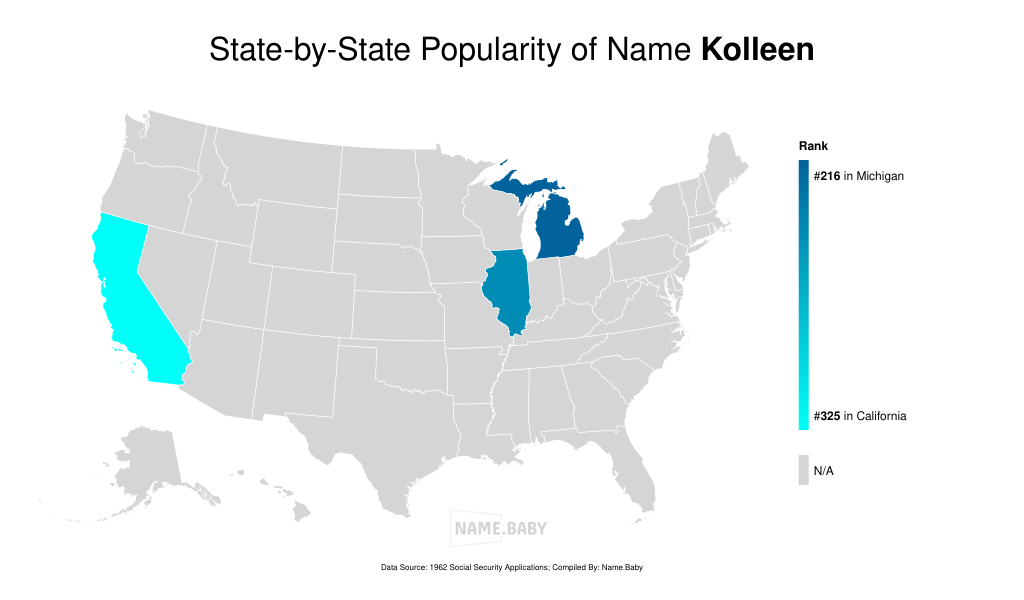 Originating from Ireland, the name Kolleen is a feminine name that carries a sense of charm and grace. Pronounced as koh-LEEN (/koʊlin/), this English name has gained popularity over the years. Its variation, Colleen, is also commonly used. The name Kolleen has been recorded in Michigan since the 1960s, with a modest number of occurrences each year. Although its ranking may have fluctuated throughout the years, it remains a beloved choice for parents seeking a timeless and elegant name for their baby girl.