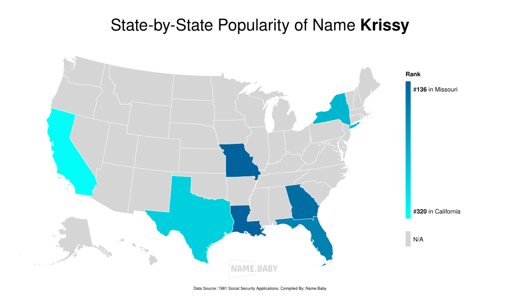 Krissy functions as an English‐language diminutive of Christine and Christina—names that trace their etymology to the Greek christós, “anointed,” via the Latin Christianus—and embodies the Anglo‐American propensity for affectionate hypocorisms. Employed chiefly as a feminine given name, Krissy has historically conveyed both the formal resonance of its root and a more intimate, approachable quality conferred by the –y suffix. Examination of Louisiana birth‐registration data from 1978 through 1981 reveals that the name achieved its peak frequency in 1978, with eighteen occurrences (rank 118), and subsequently experienced a gradual decline to seven occurrences (rank 129) in 1979, eight (rank 134) in 1980, and seven (rank 136) in 1981. This downward trajectory, when viewed against broader national naming trends of the late 1970s, suggests a period of modest popularity followed by increasing preference for alternative Christian‐derived diminutives.