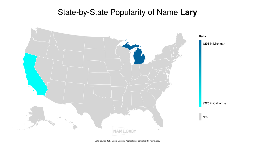 Lary is a male name with English origins. It is pronounced as LAIR-ee (/lɑˈri/). The name Lary has variations, including Larry. Lary has been given to newborn boys in California since at least 1946, with occurrences reported in various years. While not among the most popular names, it still holds a place in history and may hold personal significance to those considering it for their baby boy.