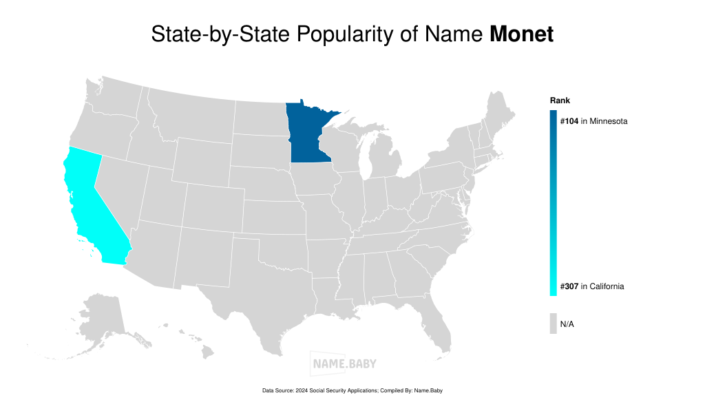 Monet, pronounced moh-NAY, carries the graceful elegance of its French surname origins and instantly evokes the shimmering water lilies and misty mornings immortalized by Claude Monet. It’s a name that invites a little one to see the world in vibrant hues, painting life with fresh strokes of creativity and wonder. In the US, Monet has held a spot in the top 1,000 since the 1950s, and with 45 newborns—landing at #905—in 2024, it’s a choice that feels both timeless and distinct. Warm, refined and playfully inspiring—no easel required—Monet offers a brushstroke of artistry for your daughter’s story.