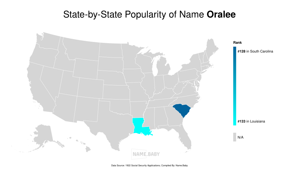 Oralee is a charming and feminine name of American origin. It is derived from the Latin word "aurum," meaning gold, and carries connotations of preciousness and beauty. The name Oralee has a delicate and elegant sound, making it an appealing choice for parents seeking a distinctive yet timeless name for their daughter. In South Carolina, Oralee has been in use for almost a century, with sporadic but consistent occurrences since the early 1900s. The name's rarity adds to its allure, making it a unique option for families looking for something special for their baby girl.